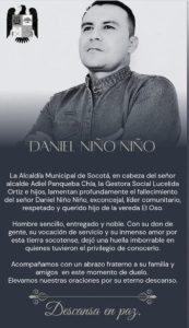 Daniel Niño Niño, además de su periodo como concejal (2017-2019), se desempeñaba actualmente como miembro de una Junta de Acción Comunal, impulsando pequeños proyectos de infraestructura, recuperación de caminos y mejoramiento de vías terciarias. Su compromiso social le valió el reconocimiento como una persona cercana, respetada y siempre dispuesta a tender la mano a quienes más lo necesitaban.