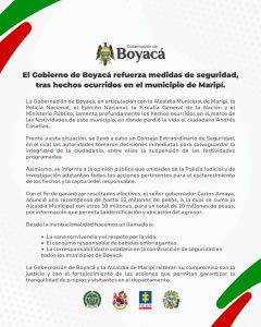 Ante la situación, la Administración Municipal decidió suspender inmediatamente las celebraciones. El alcalde de Maripí, Miller Romero, informó que se instaló un Puesto de Mando Unificado y se llevó a cabo un Consejo Extraordinario de Seguridad con el acompañamiento de la Gobernación de Boyacá. “Es un hecho lamentable en la noche del sábado. Desafortunadamente perdemos un maripense en un escenario familiar. Tomamos la decisión de suspender las festividades, que podrían reprogramarse para el mes de noviembre”, señaló el mandatario local.