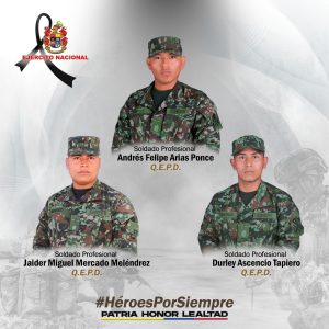 Las víctimas fatales fueron identificadas como el soldado Durley Ascencio Tapiero, oriundo de La Montañita (Caquetá); Andrés Felipe Arias Ponce, de Córdoba (Bolívar); y Hayder Miguel Mercado Meléndez, de Ciénaga (Magdalena).